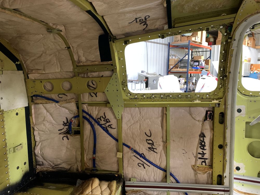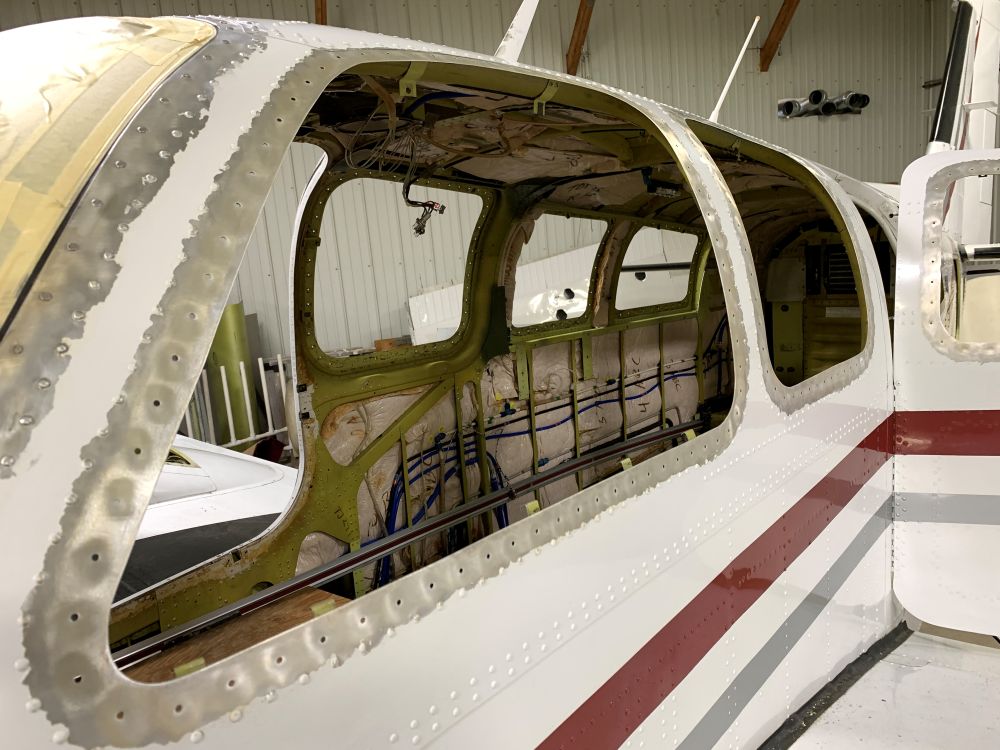 Paint is stripped around the windshield and each window, then side windows are removed. Cabin floor is inspected and cleaned, and fuel cells are replaced.
